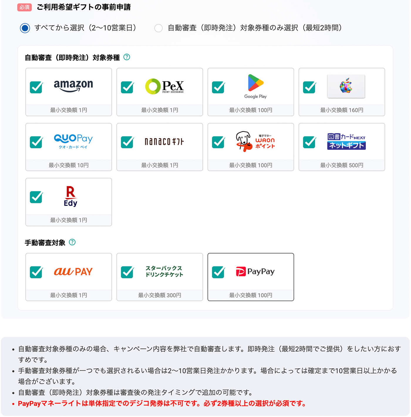 ※PayPayマネーライトは単体指定でのデジコ発券は不可です。必ず2券種以上の選択が必須です。