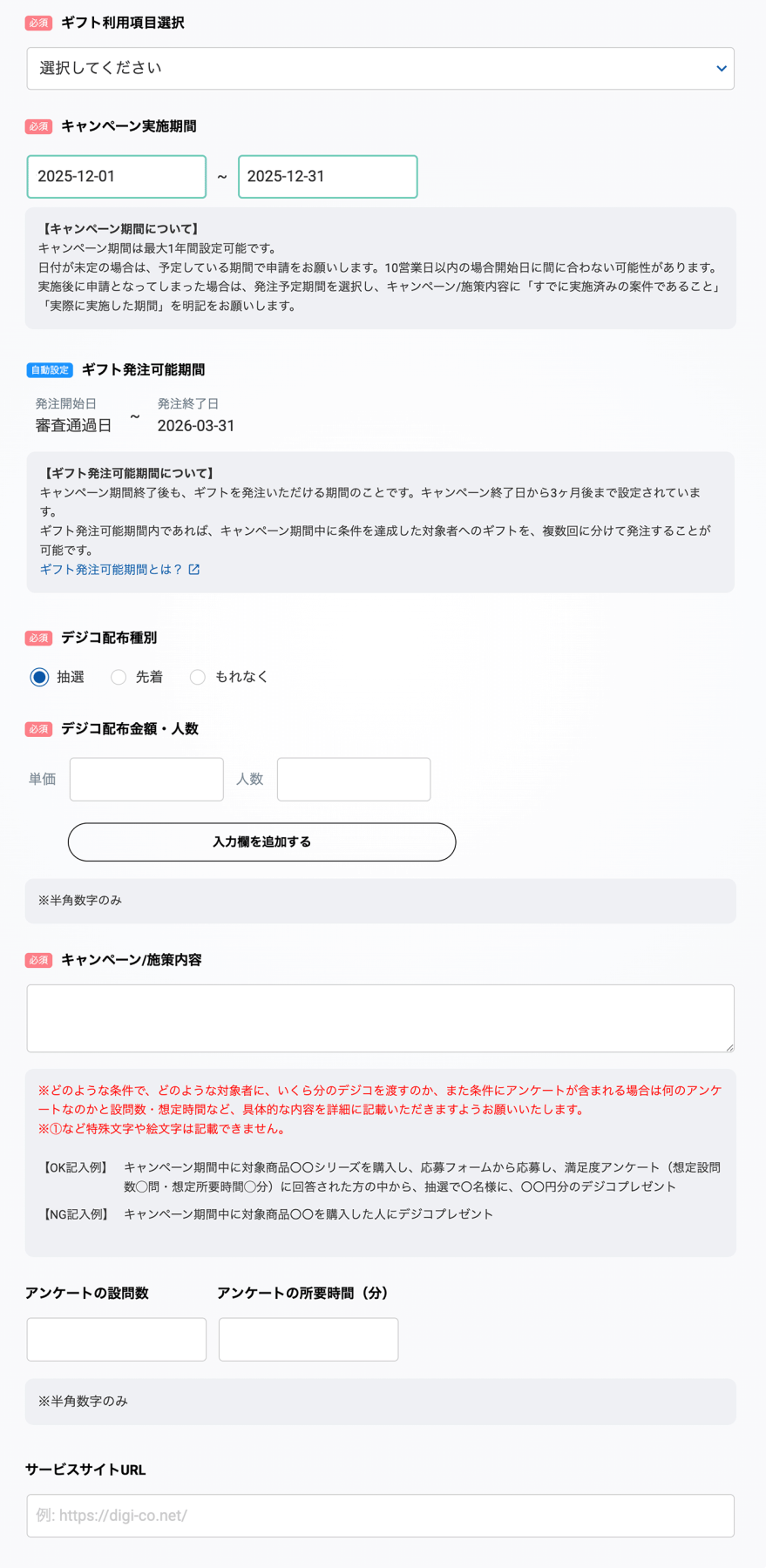 どのような条件で、どのような対象者に、いくら分のデジコを渡すのか、また条件にアンケートが含まれる場合は何のアンケートなのかと設問数・想定時間など、具体的な内容を詳細に記載いただきますようお願いいたします。